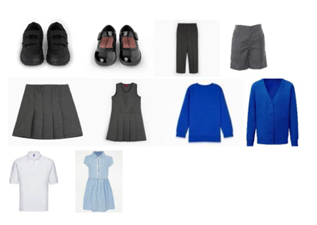 Royal blue or black shorts and white t-shirt with plimsolls or trainers when outdoors. Dark coloured tracksuits may be worn in cold weather.